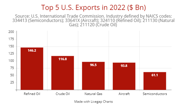 Semiconductors are a big export for the United States. Exports were worth $61.1 billion in 2022. This makes microchips the fifth-highest U.S. export behind refined oil, crude oil, natural gas, and aircraft. Semiconductors make up the largest share of U.S. electronic product exports followed by radio and TV broadcasting and wireless communication equipment, computer equipment, computers, and electromedical devices.